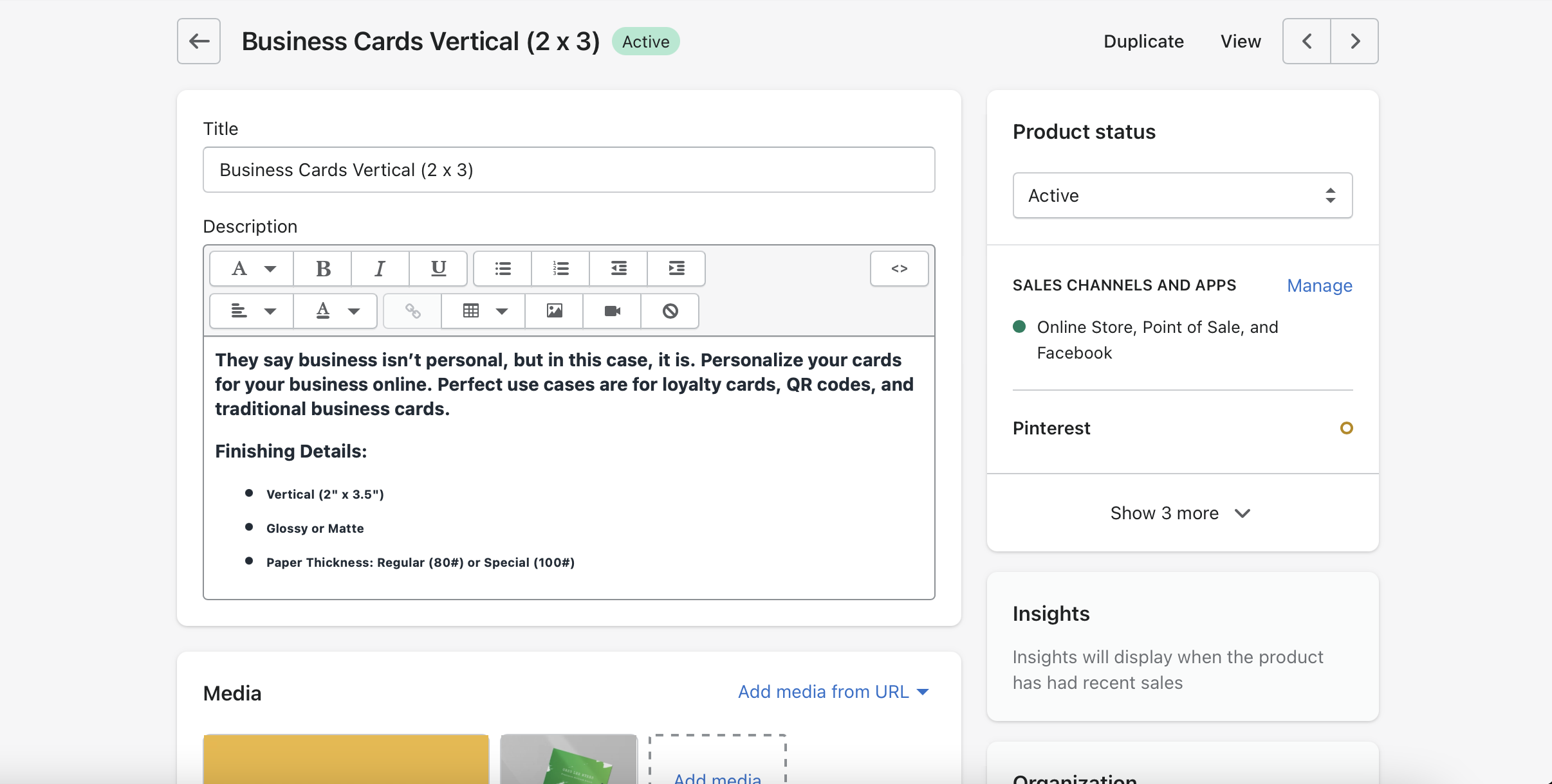 After having the backend of the website developed, I needed to have a basic product line available once the website is launched. I knew that a print shop could have multiple items for people to print, but I wanted a small and simple list to start out and have plans to have other workers develop and build the list. In order to get this done, I had conducted a sales report to get a gauge on the most purchased items. In this report, I found that business cards, 5x7 flyers, and medium sized posters (11x17) were very popular. While making the list I made sure to include those three items. I then had conducted multiple meetings with my supervisor to create short and detailed product descriptions. My supervisor knows a lot about paper, so I figured he’d be the best person to talk to. When it came to pricing, I made sure to make prices better than our competitors, but still in range to where we can make a great amount of profit. Thanks to our meeting about creating firm prices for products, I was able to reveal that the company had been undercharging considerably low.